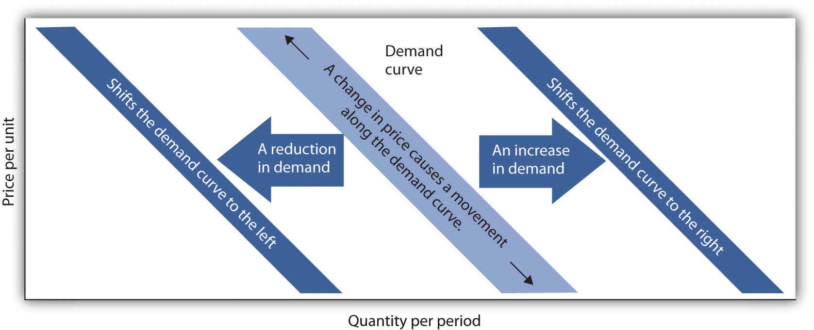 A change in price, with no change in any of the other variables that affect demand, results in a movement along the demand curve. For example, if the price of coffee falls from $6 to $5 per pound, consumption rises from 25 million pounds to 30 million pounds per month. That is a movement from point A to point B along the demand curve in Figure 3.1 "A Demand Schedule and a Demand Curve". A movement along a demand curve that results from a change in price is called a change in quantity demandedA movement along a demand curve that results from a change in price.. Note that a change in quantity demanded is not a change or shift in the demand curve; it is a movement along the demand curve.