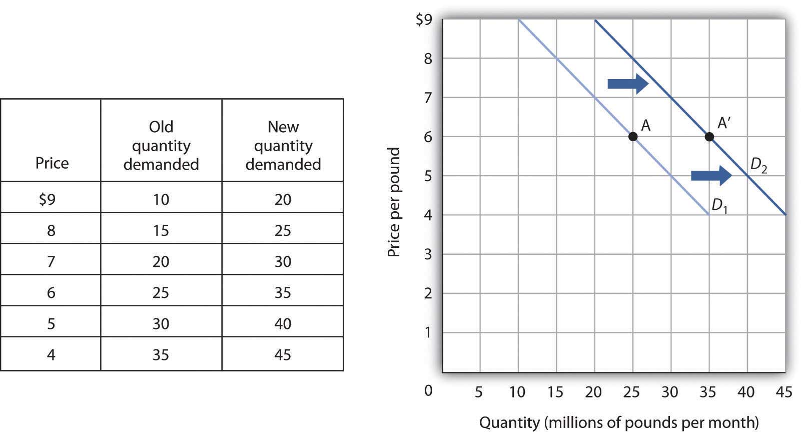 An increase in the quantity of a good or service demanded at each price is shown as an increase in demand. Here, the original demand curve D1 shifts to D2. Point A on D1 corresponds to a price of $6 per pound and a quantity demanded of 25 million pounds of coffee per month. On the new demand curve D2, the quantity demanded at this price rises to 35 million pounds of coffee per month (point A′).