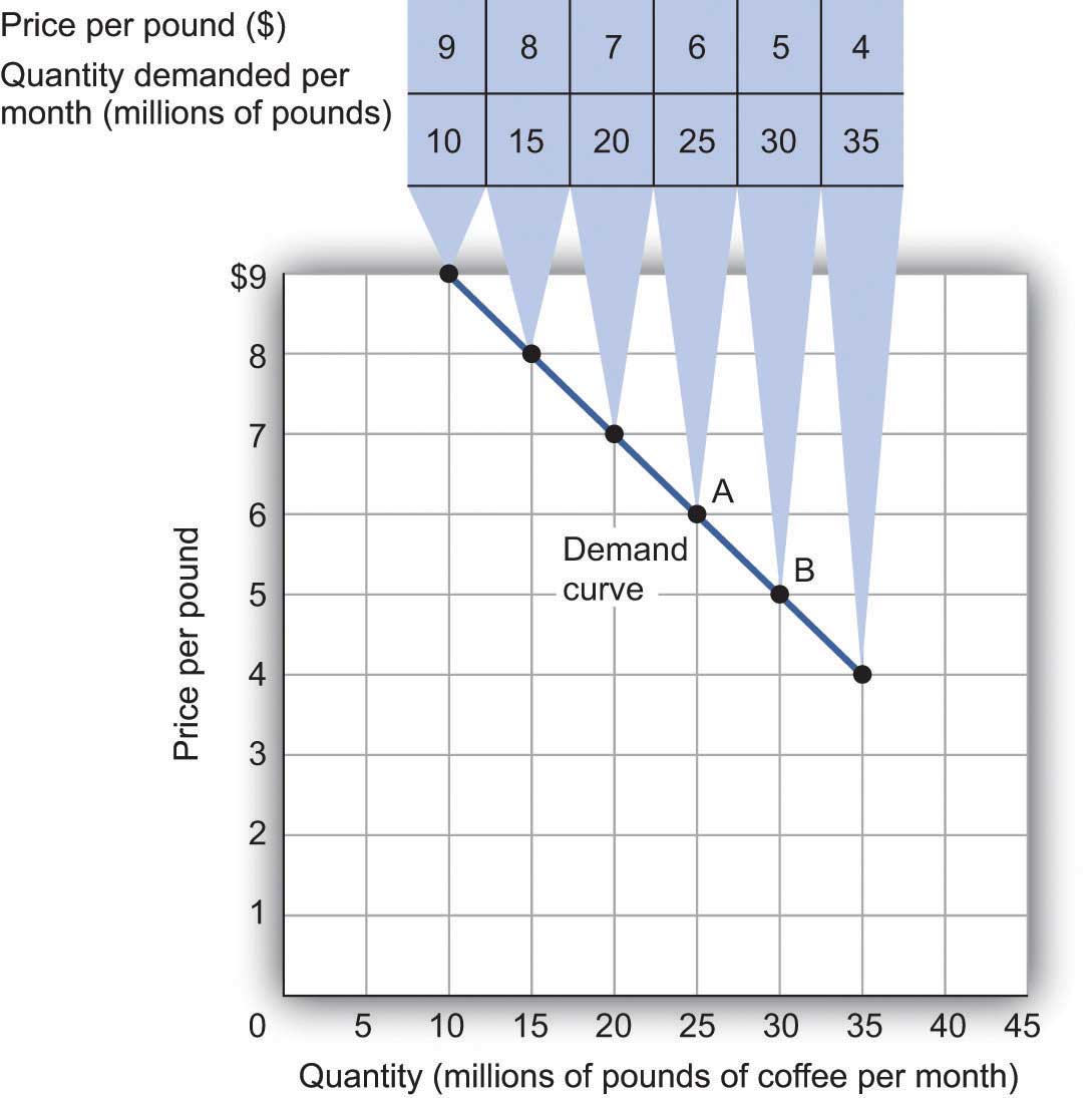The table is a demand schedule; it shows quantities of coffee demanded per month in the United States at particular prices, all other things unchanged. These data are then plotted on the demand curve. At point A on the curve, 25 million pounds of coffee per month are demanded at a price of $6 per pound. At point B, 30 million pounds of coffee per month are demanded at a price of $5 per pound.