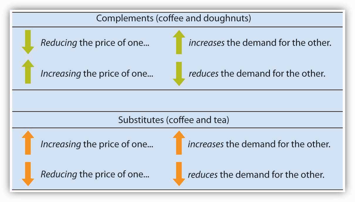 In general, if a reduction in the price of one good increases the demand for another, the two goods are called complementsTwo goods for which an increase in price of one reduces the demand for the other.. If a reduction in the price of one good reduces the demand for another, the two goods are called substitutesTwo goods for which an increase in price of one increases the demand for the other.. These definitions hold in reverse as well: two goods are complements if an increase in the price of one reduces the demand for the other, and they are substitutes if an increase in the price of one increases the demand for the other. Doughnuts and coffee are complements; tea and coffee are substitutes.
