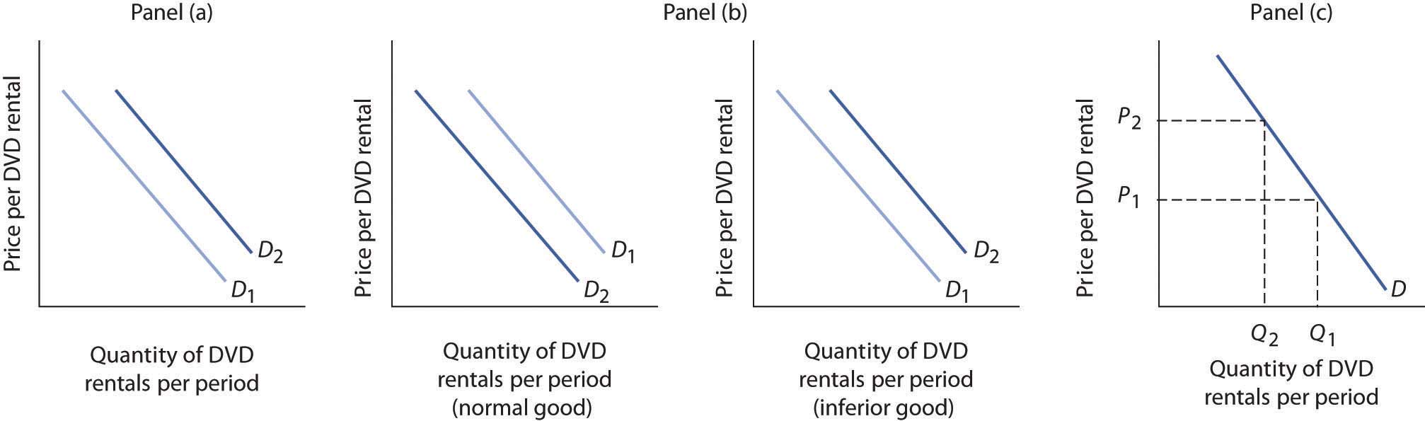 An increase in the price of DVD rentals does not shift the demand curve for DVD rentals at all; rather, an increase in price, say from P1 to P2, is a movement upward to the left along the demand curve. At a higher price, people will rent fewer DVDs, say Q2 instead of Q1, ceteris paribus [Panel (c)].