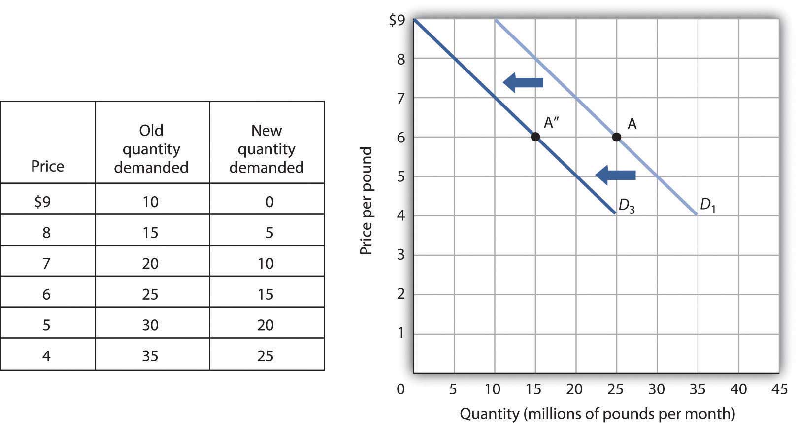 A reduction in the demand for coffee is illustrated in Figure 3.3 "A Reduction in Demand". The demand schedule shows that less coffee is demanded at each price than in Figure 3.1 "A Demand Schedule and a Demand Curve". The result is a shift in demand from the original curve D1 to D3. The quantity of coffee demanded at a price of $6 per pound falls from 25 million pounds per month (point A) to 15 million pounds per month (point A″). Note, again, that a change in quantity demanded, ceteris paribus, refers to a movement along the demand curve, while a change in demand refers to a shift in the demand curve.