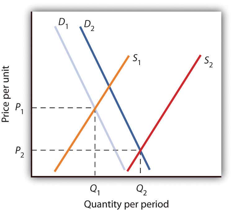 Figure 4.1 "The Personal Computer Market" illustrates changes that have occurred in the computer market. The horizontal axis shows the quantity of quality-adjusted personal computers. Thus, the quantity axis can be thought of as a unit of computing power. Similarly, the price axis shows the price per unit of computing power. The rapid increase in the number of firms, together with dramatic technological improvements, led to an increase in supply, shifting the supply curve in Figure 4.1 "The Personal Computer Market" to the right from S1 to S2.
