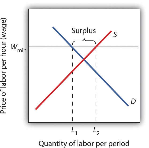 A minimum wage (Wmin) that is set above the equilibrium wage would create a surplus of unskilled labor equal to (L2 - L1). That is, L2 units of unskilled labor are offered at the minimum wage, but companies only want to use L1 units at that wage. Because unskilled workers are a substitute for a skilled workers, forcing the price of unskilled workers higher would increase the demand for skilled labor and thus increase their wages.