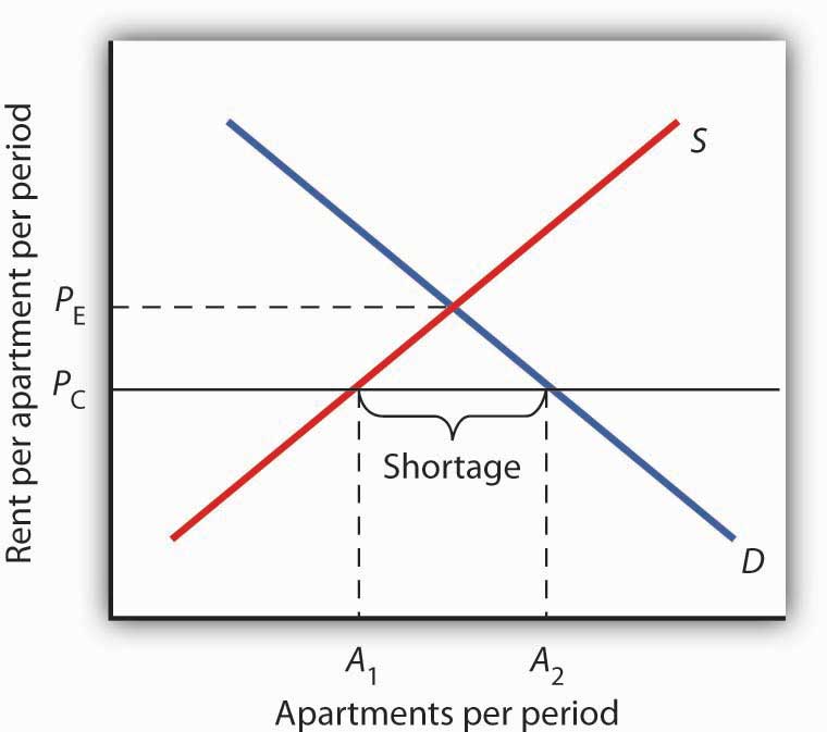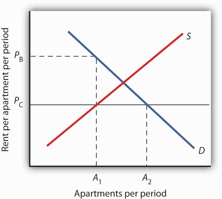 Suppose the government sets the price of an apartment at PC in Figure 4.8 "Effect of a Price Ceiling on the Market for Apartments". Notice that PC is below the equilibrium price of PE. At PC, we read over to the supply curve to find that sellers are willing to offer A1 apartments. Reading over to the demand curve, we find that consumers would like to rent A2 apartments at the price ceiling of PC. Because PC is below the equilibrium price, there is a shortage of apartments equal to (A2 - A1). (Notice that if the price ceiling were set above the equilibrium price it would have no effect on the market since the law would not prohibit the price from settling at an equilibrium price that is lower than the price ceiling.)