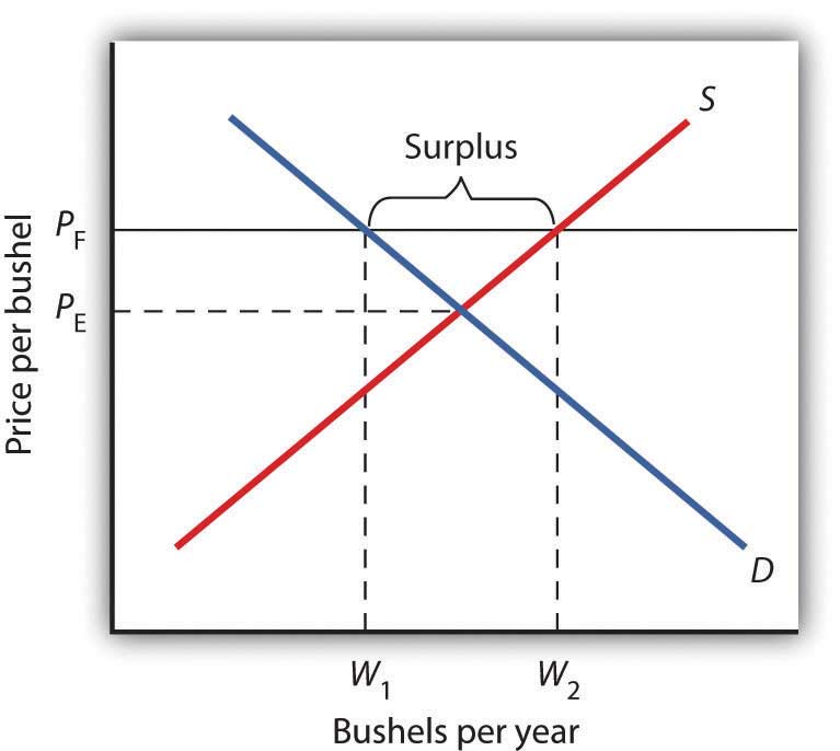 Figure 4.6 "Price Floors in Wheat Markets" shows the market for wheat. Suppose the government sets the price of wheat at PF. Notice that PF is above the equilibrium price of PE. At PF, we read over to the demand curve to find that the quantity of wheat that buyers will be willing and able to purchase is W1 bushels. Reading over to the supply curve, we find that sellers will offer W2 bushels of wheat at the price floor of PF. Because PF is above the equilibrium price, there is a surplus of wheat equal to (W2 − W1) bushels. The surplus persists because the government does not allow the price to fall.