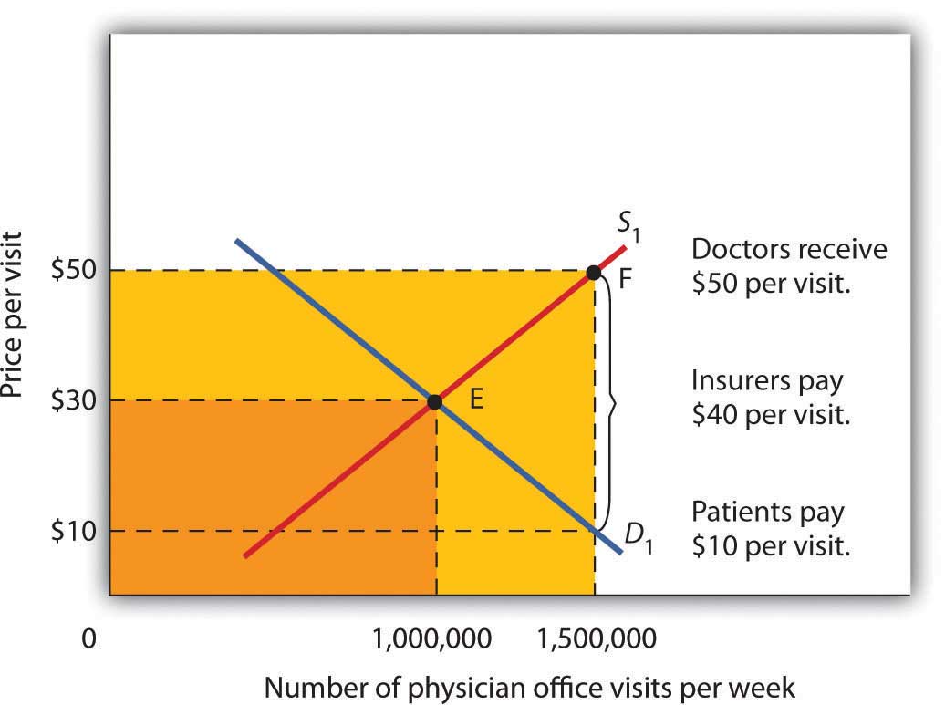 Insurers make up the difference between the fees doctors receive and the price patients pay. In our example, insurers pay $40 per visit of insured patients to supplement the $10 that patients pay. When an agent other than the seller or the buyer pays part of the price of a good or service, we say that the agent is a third-party payerAn agent other than the seller or the buyer who pays part of the price of a good or service..