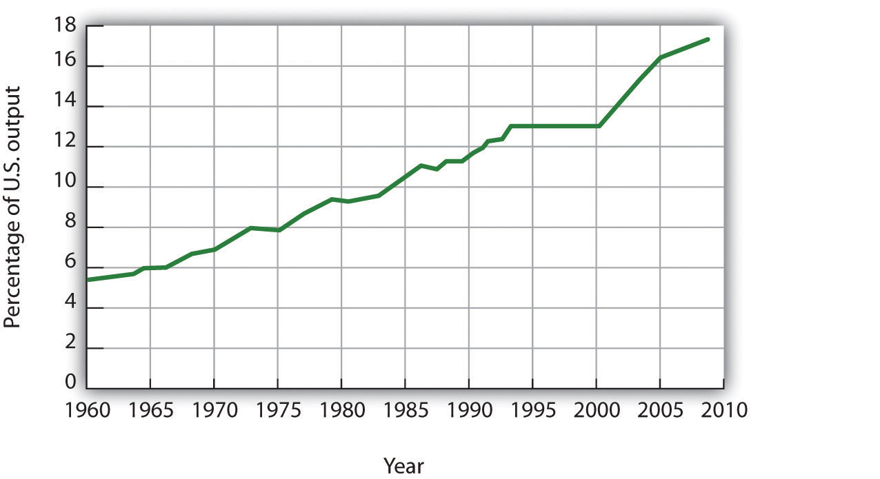 Figure 4.10 "Health-Care Spending as a Percentage of U.S. Output, 1960–2009" shows the share of U.S. output devoted to health care since 1960. In 1960, about 5% of total output was devoted to health care; by 2009 this share had risen to 17.6%. That means that we are devoting more of our spending to health care and less to other goods and services.