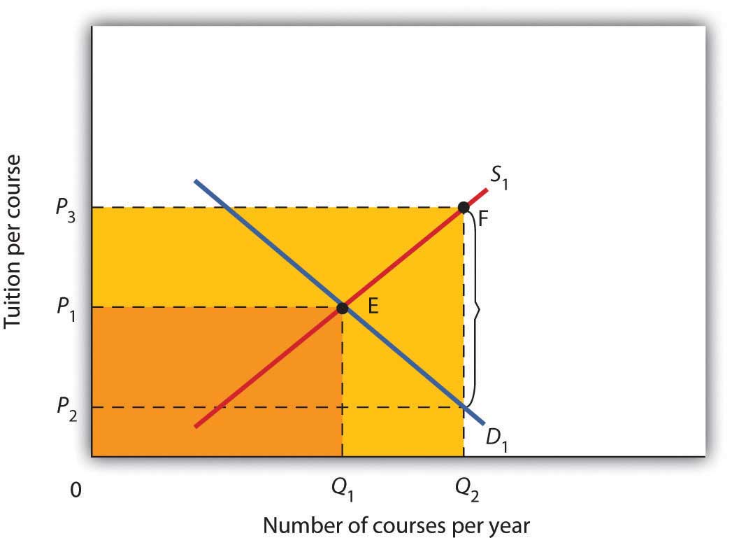 The provision of university education through taxpayer-supported state universities is another example of a market with a third-party payer. Use the model of demand and supply to discuss the impact this has on the higher education market. Specifically, draw a graph similar to Figure 4.12 "Total Spending for Physician Office Visits Covered by Insurance". How would you label the axes? Show the equilibrium price and quantity in the absence of a third-party payer and indicate total spending on education. Now show the impact of lower tuition As a result of state support for education. How much education do students demand at the lower tuition? How much tuition must educational institutions receive to produce that much education? How much spending on education will occur? Compare total spending before and after a third-party payer enters this market.