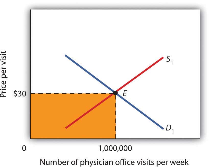 Figure 4.11 "Total Spending for Physician Office Visits" shows the market, assuming that it operates in a fashion similar to other markets. The demand curve D1 and the supply curve S1 intersect at point E, with an equilibrium price of $30 per office visit. The equilibrium quantity of office visits per week is 1,000,000.