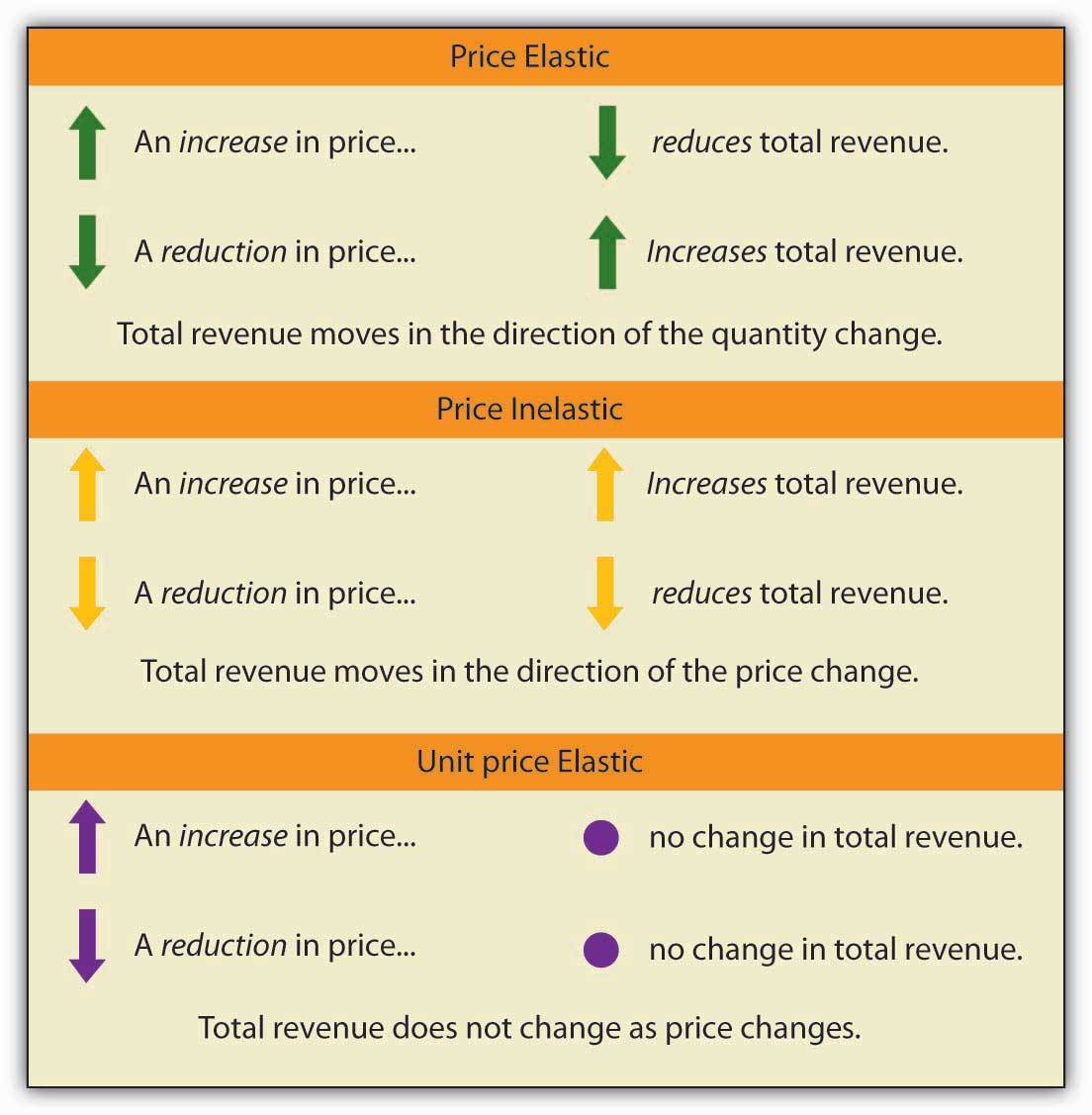 When the price of a good or service changes, the quantity demanded changes in the opposite direction. Total revenue will move in the direction of the variable that changes by the larger percentage. If the variables move by the same percentage, total revenue stays the same. If quantity demanded changes by a larger percentage than price (i.e., if demand is price elastic), total revenue will change in the direction of the quantity change. If price changes by a larger percentage than quantity demanded (i.e., if demand is price inelastic), total revenue will move in the direction of the price change. If price and quantity demanded change by the same percentage (i.e., if demand is unit price elastic), then total revenue does not change.