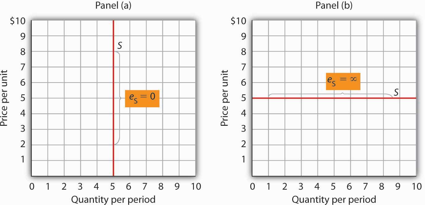 Supply is price elastic if the price elasticity of supply is greater than 1, unit price elastic if it is equal to 1, and price inelastic if it is less than 1. A vertical supply curve, as shown in Panel (a) of Figure 5.6 "Supply Curves and Their Price Elasticities", is perfectly inelastic; its price elasticity of supply is zero. The supply of Beatles’ songs is perfectly inelastic because the band no longer exists. A horizontal supply curve, as shown in Panel (b) of Figure 5.6 "Supply Curves and Their Price Elasticities", is perfectly elastic; its price elasticity of supply is infinite. It means that suppliers are willing to supply any amount at a certain price.