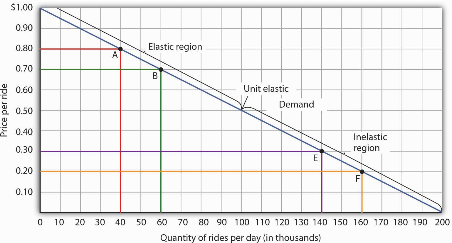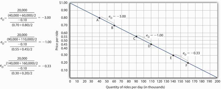 Figure 5.2 "Price Elasticities of Demand for a Linear Demand Curve" shows the same demand curve we saw in Figure 5.1 "Responsiveness and Demand". We have already calculated the price elasticity of demand between points A and B; it equals −3.00. Notice, however, that when we use the same method to compute the price elasticity of demand between other sets of points, our answer varies. For each of the pairs of points shown, the changes in price and quantity demanded are the same (a $0.10 decrease in price and 20,000 additional rides per day, respectively). But at the high prices and low quantities on the upper part of the demand curve, the percentage change in quantity is relatively large, whereas the percentage change in price is relatively small. The absolute value of the price elasticity of demand is thus relatively large. As we move down the demand curve, equal changes in quantity represent smaller and smaller percentage changes, whereas equal changes in price represent larger and larger percentage changes, and the absolute value of the elasticity measure declines. Between points C and D, for example, the price elasticity of demand is −1.00, and between points E and F the price elasticity of demand is −0.33.