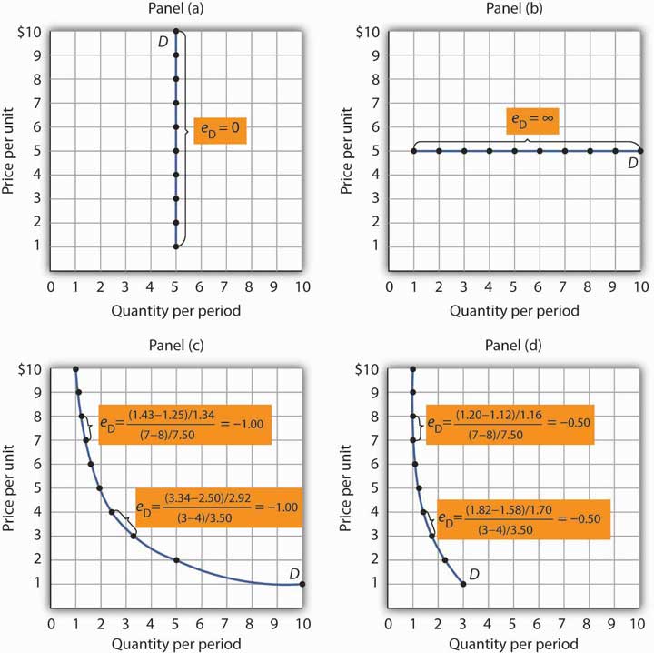The demand curve in Panel (a) is perfectly inelastic. The demand curve in Panel (b) is perfectly elastic. Price elasticity of demand is −1.00 all along the demand curve in Panel (c), whereas it is −0.50 all along the demand curve in Panel (d).