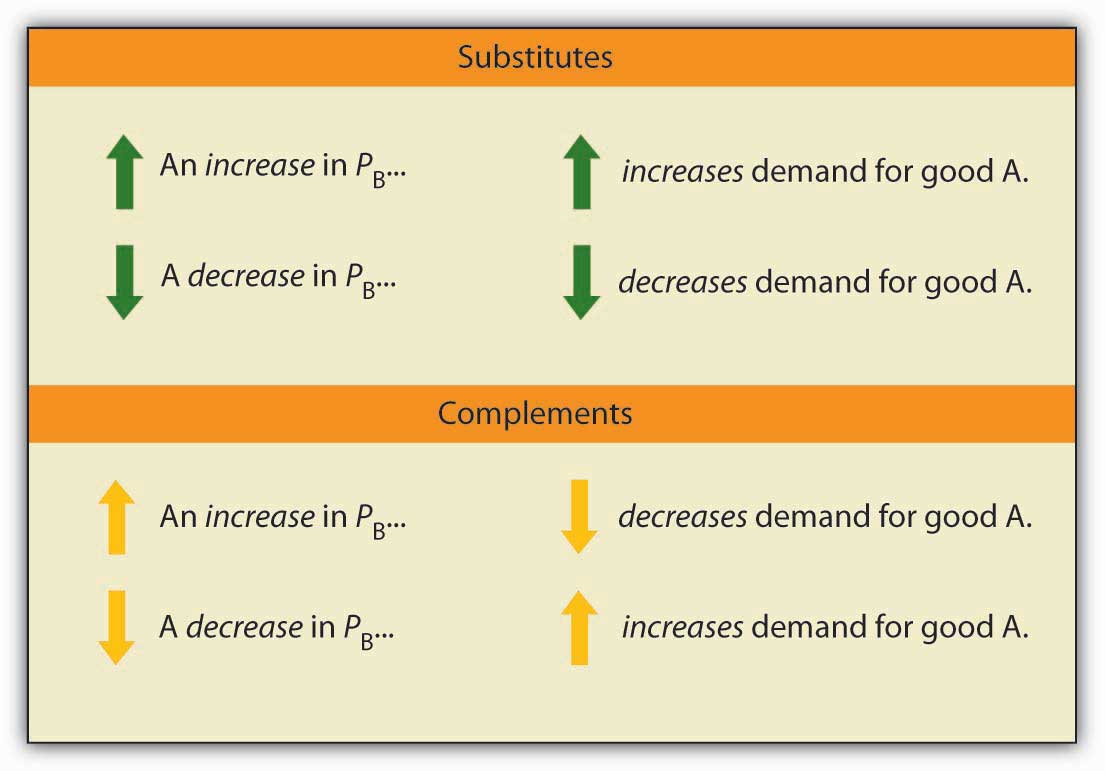 The demand for a good or service is affected by the prices of related goods or services. A reduction in the price of salsa, for example, would increase the demand for chips, suggesting that salsa is a complement of chips. A reduction in the price of chips, however, would reduce the demand for peanuts, suggesting that chips are a substitute for peanuts.