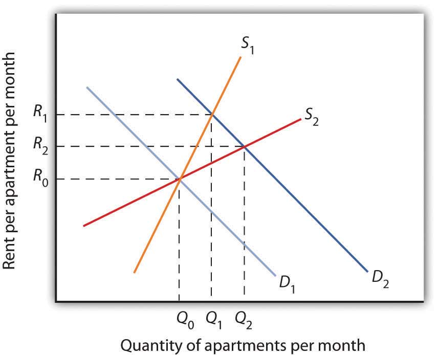 If the period of time under consideration is a few years rather than a few months, the supply curve is likely to be much more price elastic. Over time, buildings can be converted from other uses and new apartment complexes can be built. A supply curve corresponding to a longer period of time would look like S2 in Figure 5.5 "Increase in Apartment Rents Depends on How Responsive Supply Is".