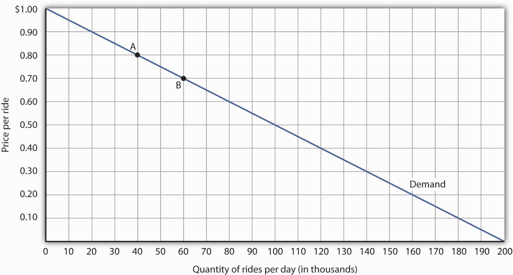 Figure 5.1 "Responsiveness and Demand" shows a particular demand curve, a linear demand curve for public transit rides. Suppose the initial price is $0.80, and the quantity demanded is 40,000 rides per day; we are at point A on the curve. Now suppose the price falls to $0.70, and we want to report the responsiveness of the quantity demanded. We see that at the new price, the quantity demanded rises to 60,000 rides per day (point B). To compute the elasticity, we need to compute the percentage changes in price and in quantity demanded between points A and B.