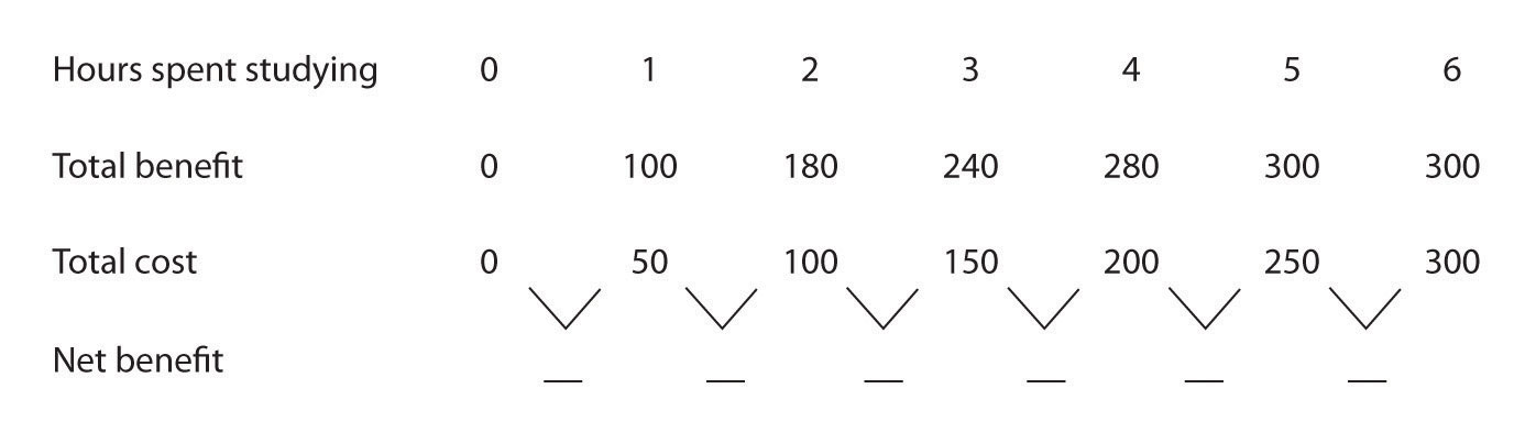 Joe Higgins is thinking about how much time to spend studying for a biology exam tomorrow. Using “utility units” he measures the benefits and costs of study; his calculations are shown in the following table.
