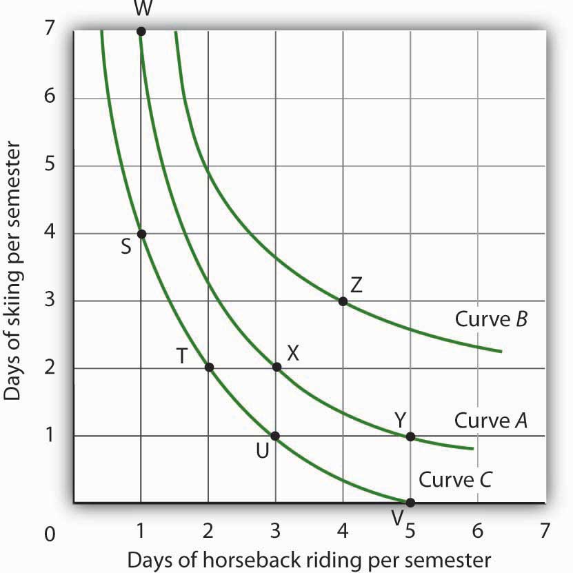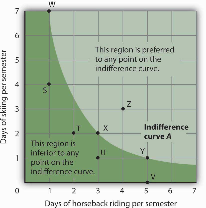 Now look at point T in Figure 7.7 "An Indifference Curve". It has the same amount of skiing as point X, but fewer days are spent horseback riding. Ms. Bain would thus prefer point X to point T. Similarly, she prefers X to U. What about a choice between the combinations at point W and point T? Because combinations X and W are equally satisfactory, and because Ms. Bain prefers X to T, she must prefer W to T. In general, any combination of two goods that lies below and to the left of an indifference curve for those goods yields less utility than any combination on the indifference curve. Such combinations are inferior to combinations on the indifference curve.