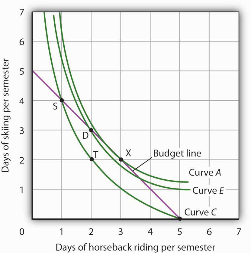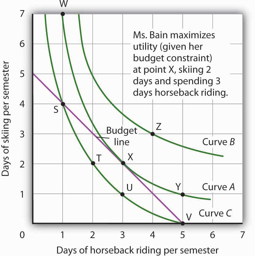 Figure 7.10 "The Utility-Maximizing Solution" combines Janet Bain’s budget line from Figure 7.6 "The Budget Line" with her indifference curves from Figure 7.8 "Indifference Curves". Our two conditions for utility maximization are satisfied at point X, where she skis 2 days per semester and spends 3 days horseback riding.
