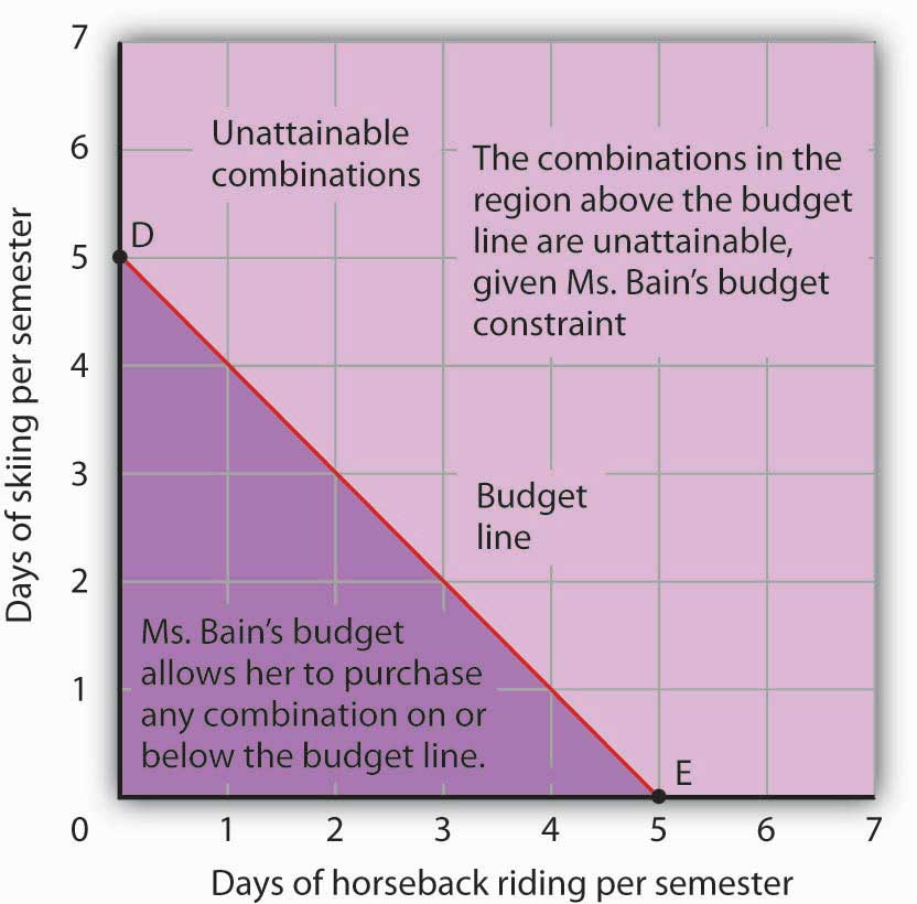 The budget line shows all the combinations of skiing and horseback riding Ms. Bain can purchase with her budget of $250. She could also spend less than $250, purchasing combinations that lie below and to the left of the budget line in Figure 7.6 "The Budget Line". Combinations above and to the right of the budget line are beyond the reach of her budget.