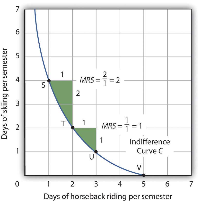 The slope of an indifference curve shows the rate at which two goods can be exchanged without affecting the consumer’s utility. Figure 7.9 "The Marginal Rate of Substitution" shows indifference curve C from Figure 7.8 "Indifference Curves". Suppose Ms. Bain is at point S, consuming 4 days of skiing and 1 day of horseback riding per semester. Suppose she spends another day horseback riding. This additional day of horseback riding does not affect her utility if she gives up 2 days of skiing, moving to point T. She is thus willing to give up 2 days of skiing for a second day of horseback riding. The curve shows, however, that she would be willing to give up at most 1 day of skiing to obtain a third day of horseback riding (shown by point U).