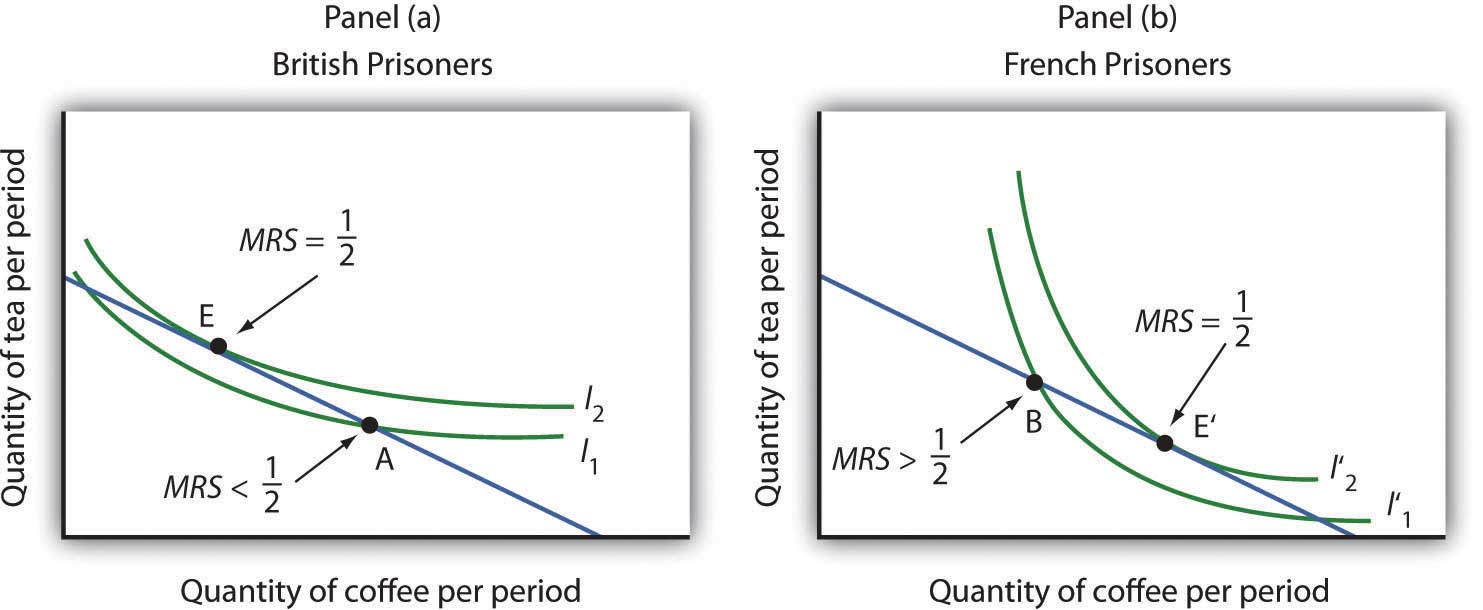 Suppose the ration packages given to all prisoners contained the same amounts of both coffee and tea. But notice that for typical British prisoners, given indifference curves which reflect their general preference for tea, the MRS at the initial allocation (point A) is less than the price ratio. For French prisoners, the MRS is greater than the price ratio (point B). By trading, both British and French prisoners can move to higher indifference curves. For the British prisoners, the utility-maximizing solution is at point E, with more tea and little coffee. For the French prisoners the utility-maximizing solution is at point E′, with more coffee and less tea. In equilibrium, both British and French prisoners consumed tea and coffee so that their MRS’s equal 1/2, the price ratio in the market.