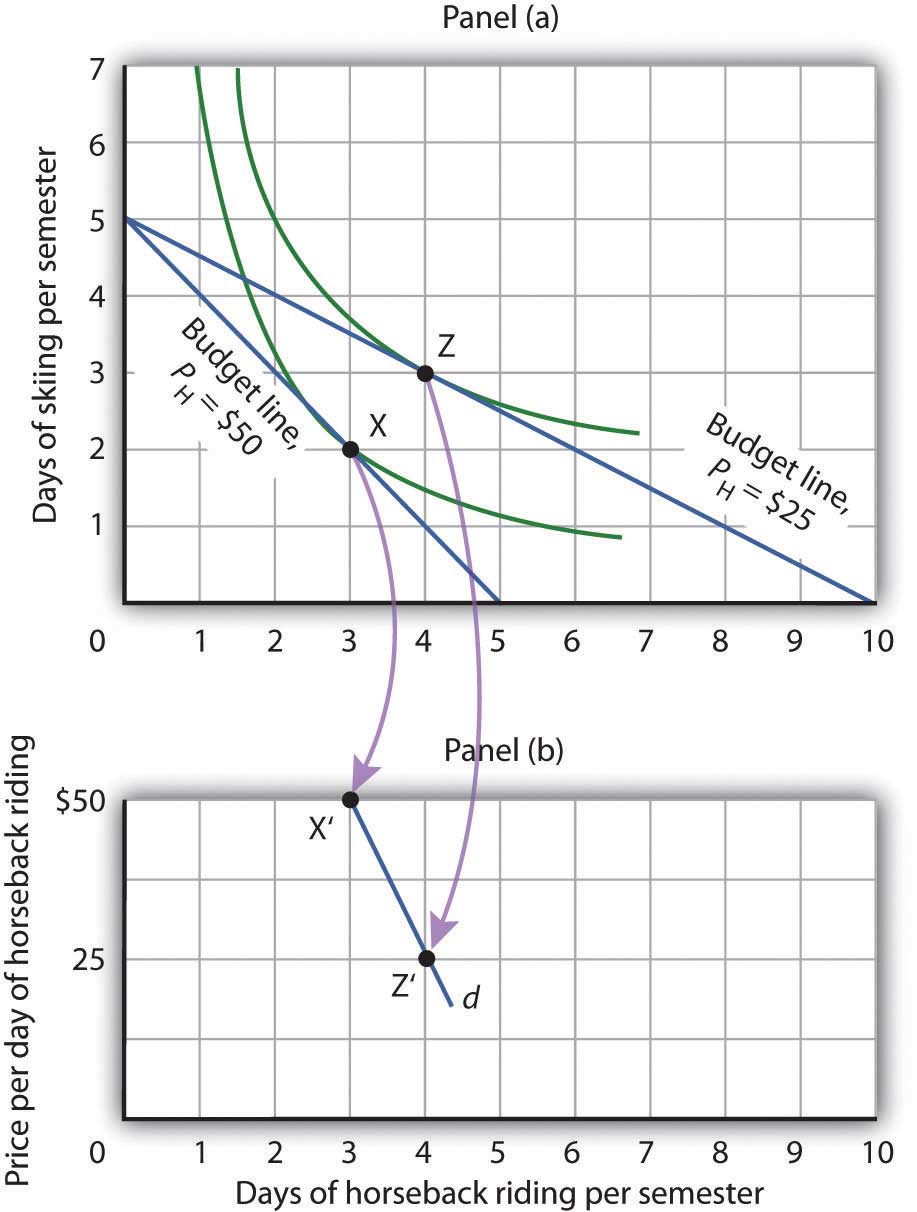 The solution at Z involves an increase in the number of days Ms. Bain spends horseback riding. Notice that only the price of horseback riding has changed; all other features of the utility-maximizing solution remain the same. Ms. Bain’s budget and the price of skiing are unchanged; this is reflected in the fact that the vertical intercept of the budget line remains fixed. Ms. Bain’s preferences are unchanged; they are reflected by her indifference curves. Because all other factors in the solution are unchanged, we can determine two points on Ms. Bain’s demand curve for horseback riding from her indifference curve diagram. At a price of $50, she maximized utility at point X, spending 3 days horseback riding per semester. When the price falls to $25, she maximizes utility at point Z, riding 4 days per semester. Those points are plotted as points X′ and Z′ on her demand curve for horseback riding in Panel (b) of Figure 7.12 "Utility Maximization and Demand".