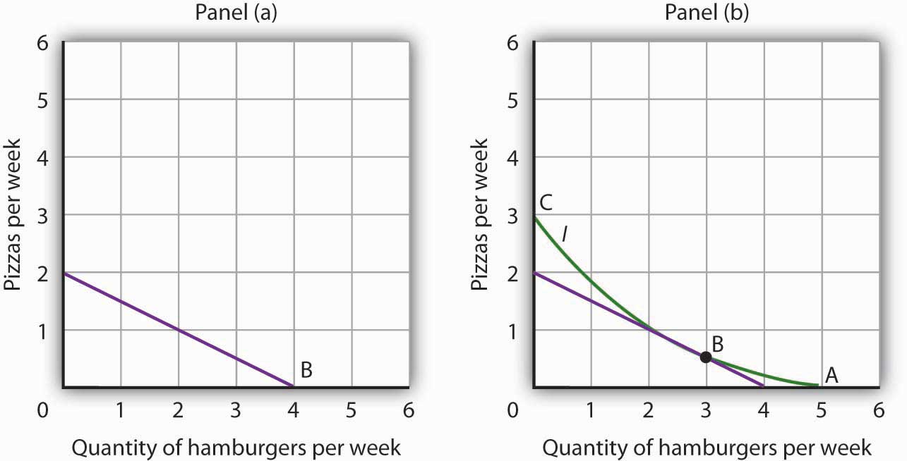 Suppose the consumer in part (a) is indifferent among the combinations of hamburgers and pizzas shown. In the grid you used to draw the budget lines, draw an indifference curve passing through the combinations shown, and label the corresponding points A, B, and C. Label this curve I.