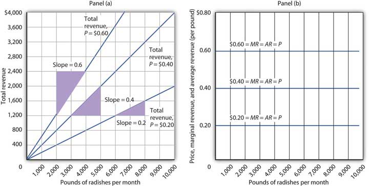 The relationship between market price and the firm’s total revenue curve is a crucial one. Panel (a) of Figure 9.2 "Total Revenue, Marginal Revenue, and Average Revenue" shows total revenue curves for a radish grower at three possible market prices: $0.20, $0.40, and $0.60 per pound. Each total revenue curve is a linear, upward-sloping curve. At any price, the greater the quantity a perfectly competitive firm sells, the greater its total revenue. Notice that the greater the price, the steeper the total revenue curve is.