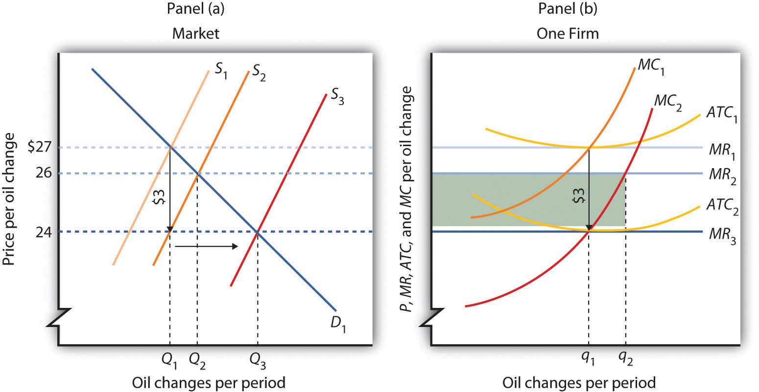 Suppose a reduction in the price of oil reduces the cost of producing oil changes for automobiles. We shall assume that the oil-change industry is perfectly competitive and that it is initially in long-run equilibrium at a price of $27 per oil change, as shown in Panel (a) of Figure 9.13 "A Reduction in the Cost of Producing Oil Changes". Suppose that the reduction in oil prices reduces the cost of an oil change by $3.