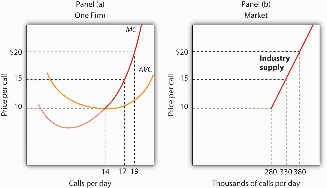Now suppose that the astrological forecast industry consists of Madame LaFarge and thousands of other firms similar to hers. The market supply curve is found by adding the outputs of each firm at each price, as shown in Panel (b) of Figure 9.8 "Marginal Cost and Supply". At a price of $10 per call, for example, Madame LaFarge supplies 14 calls per day. Adding the quantities supplied by all the other firms in the market, suppose we get a quantity supplied of 280,000. Notice that the market supply curve we have drawn is linear; throughout the book we have made the assumption that market demand and supply curves are linear in order to simplify our analysis.