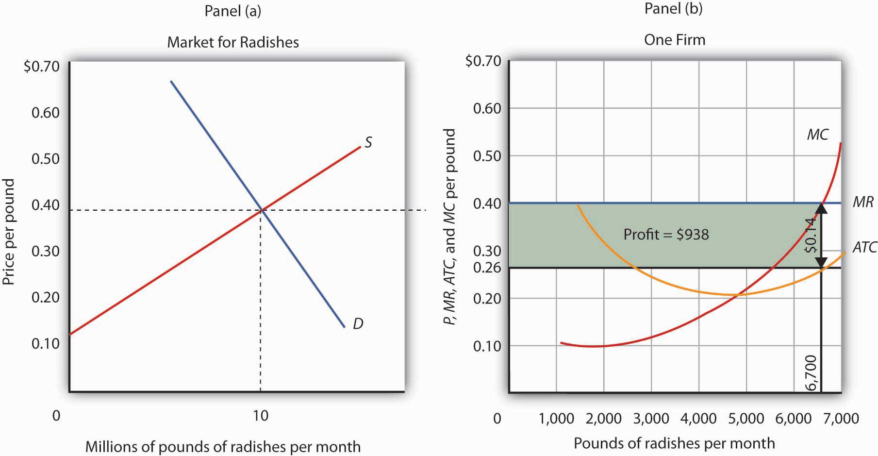 The process through which entry will eliminate economic profits in the long run is illustrated in Figure 9.9 "Eliminating Economic Profits in the Long Run", which is based on the situation presented in Figure 9.5 "Applying the Marginal Decision Rule". The price of radishes is $0.40 per pound. Mr. Gortari’s average total cost at an output of 6,700 pounds of radishes per month is $0.26 per pound. Profit per unit is $0.14 ($0.40 − $0.26). Mr. Gortari thus earns a profit of $938 per month (=$0.14 × 6,700).