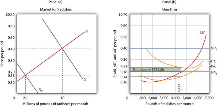 Tony Gortari experiences a loss when price drops below ATC, as it does in Panel (b) as a result of a reduction in demand. If price is above AVC, however, he can minimize his losses by producing where MC equals MR2. Here, that occurs at an output of 4,444 pounds of radishes per month. The price is $0.18 per pound, and average total cost is $0.23 per pound. He loses $0.05 per pound, or $222.20 per month.