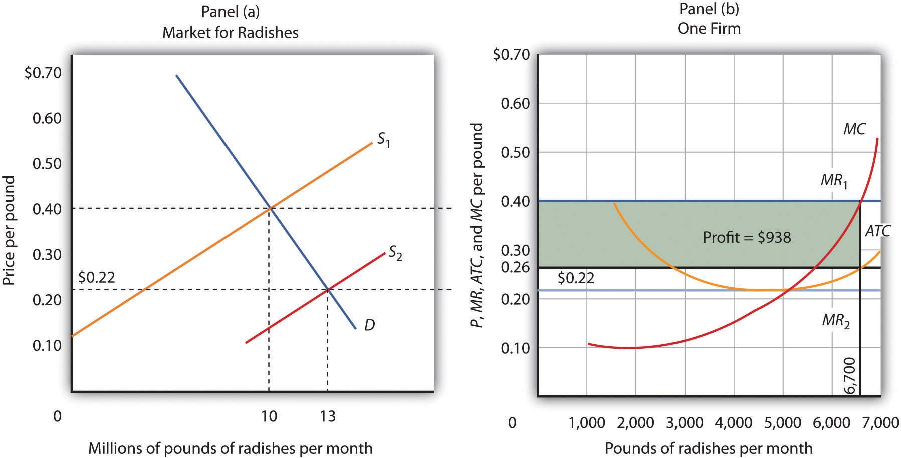 Profits in the radish industry attract entry in the long run. Panel (a) of Figure 9.9 "Eliminating Economic Profits in the Long Run" shows that as firms enter, the supply curve shifts to the right and the price of radishes falls. New firms enter as long as there are economic profits to be made—as long as price exceeds ATC in Panel (b). As price falls, marginal revenue falls to MR2 and the firm reduces the quantity it supplies, moving along the marginal cost (MC) curve to the lowest point on the ATC curve, at $0.22 per pound and an output of 5,000 pounds per month. Although the output of individual firms falls in response to falling prices, there are now more firms, so industry output rises to 13 million pounds per month in Panel (a).