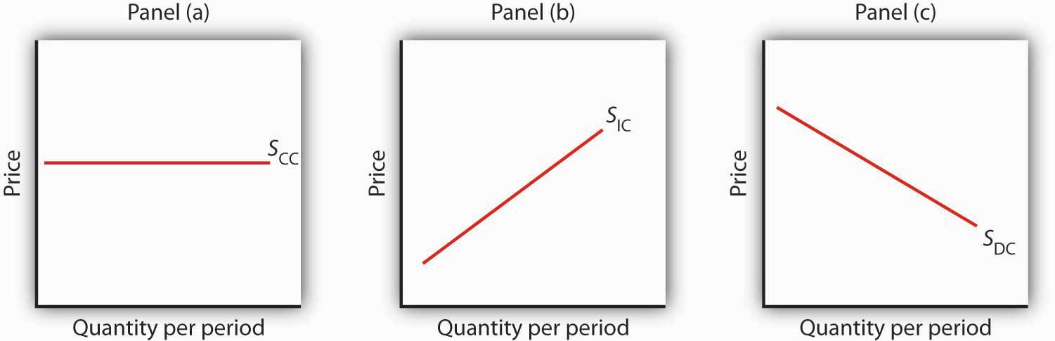 Figure 9.11 "Long-Run Supply Curves in Perfect Competition" shows three long-run industry supply curves. In Panel (a), SCC is a long-run supply curve for a constant-cost industry. It is horizontal. Neither expansion nor contraction by itself affects market price. In Panel (b), SIC is a long-run supply curve for an increasing-cost industry. It rises as the industry expands. In Panel (c), SDC is a long-run supply curve for a decreasing-cost industry. Its downward slope suggests a falling price as the industry expands.