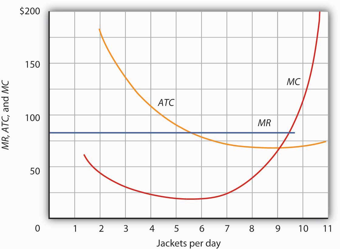 There is no reason for the profit-maximizing quantity to correspond to the lowest point on the ATC curve; it does not in this case. Students sometimes make the mistake of calculating economic profit as the difference between the price and the lowest point on the ATC curve. That gives us the maximum economic profit per unit, but we assume that firms maximize economic profit, not economic profit per unit. The firm’s economic profit equals economic profit per unit times quantity. The quantity that maximizes economic profit is determined by the intersection of ATC and MR.