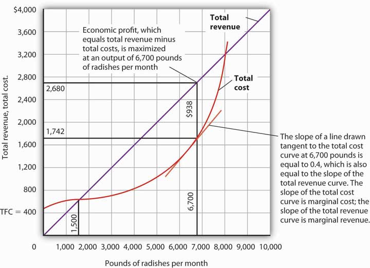 The total revenue curve’s slope does not change as the firm increases its output. But the total cost curve becomes steeper and steeper as diminishing marginal returns set in. Eventually, the total cost and total revenue curves will have the same slope. That happens in Figure 9.4 "Total Revenue, Total Cost, and Economic Profit" at an output of 6,700 pounds of radishes per month. Notice that a line drawn tangent to the total cost curve at that quantity has the same slope as the total revenue curve.