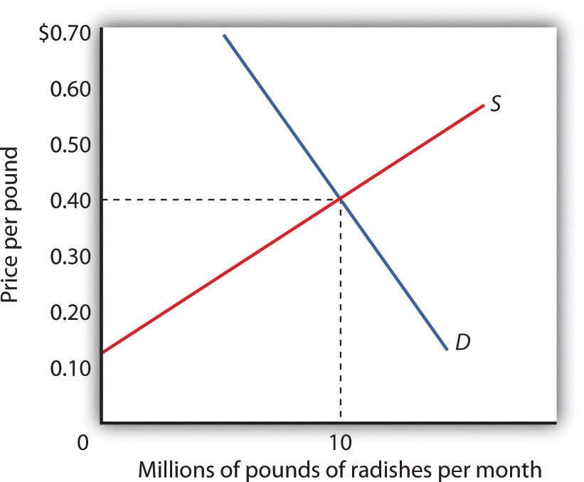 Price and output in a competitive market are determined by demand and supply. In the market for radishes, the equilibrium price is $0.40 per pound; 10 million pounds per month are produced and purchased at this price.