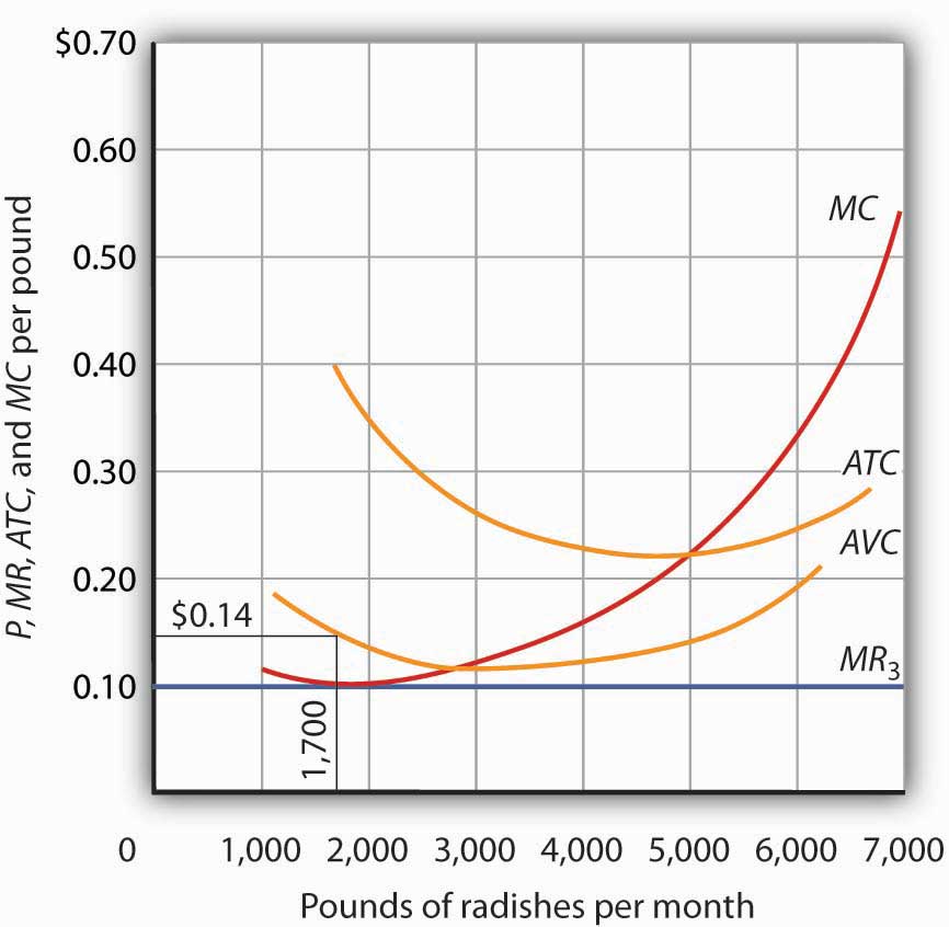 Figure 9.7 "Shutting Down" shows a case where the price of radishes drops to $0.10 per pound. Price is less than average variable cost, so Mr. Gortari not only would lose his fixed cost but would also incur additional losses by producing. Suppose, for example, he decided to operate where marginal cost equals marginal revenue, producing 1,700 pounds of radishes per month. Average variable cost equals $0.14 per pound, so he would lose $0.04 on each pound he produces ($68) plus his fixed cost of $400 per month. He would lose $468 per month. If he shut down, he would lose only his fixed cost. Because the price of $0.10 falls below his average variable cost, his best course would be to shut down.