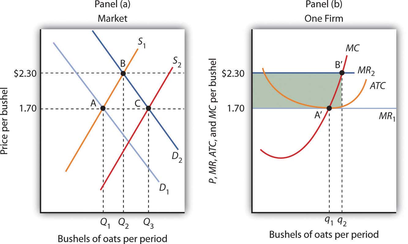 The initial equilibrium price and output are determined in the market for oats by the intersection of demand and supply at point A in Panel (a). An increase in the market demand for oats, from D1 to D2 in Panel (a), shifts the equilibrium solution to point B. The price increases in the short run from $1.70 per bushel to $2.30. Industry output rises to Q2. For a single firm, the increase in price raises marginal revenue from MR1 to MR2; the firm responds in the short run by increasing its output to q2. It earns an economic profit given by the shaded rectangle. In the long run, the opportunity for profit attracts new firms. In a constant-cost industry, the short-run supply curve shifts to S2; market equilibrium now moves to point C in Panel (a). The market price falls back to $1.70. The firm’s demand curve returns to MR1, and its output falls back to the original level, q1. Industry output has risen to Q3 because there are more firms.