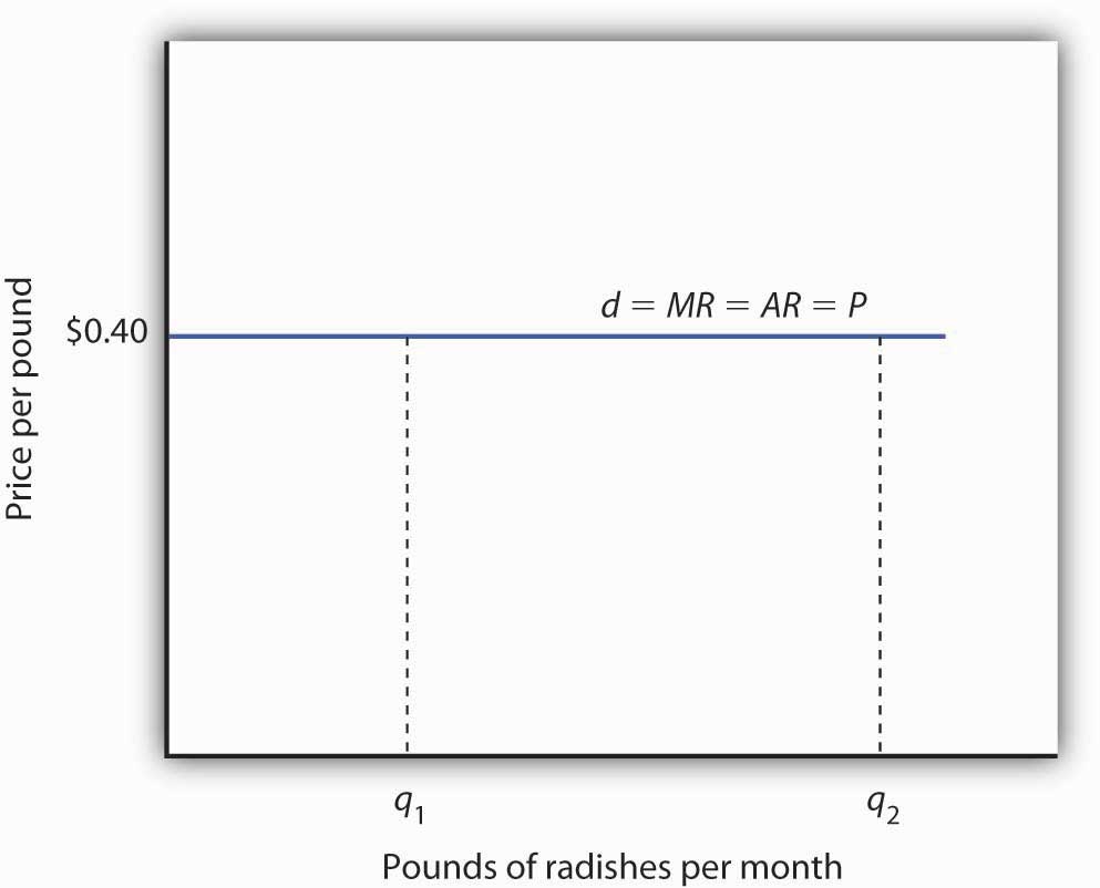 Consider the case of a single radish producer, Tony Gortari. We assume that the radish market is perfectly competitive; Mr. Gortari runs a perfectly competitive firm. Suppose the market price of radishes is $0.40 per pound. How many pounds of radishes can Mr. Gortari sell at this price? The answer comes from our assumption that he is a price taker: He can sell any quantity he wishes at this price. How many pounds of radishes will he sell if he charges a price that exceeds the market price? None. His radishes are identical to those of every other firm in the market, and everyone in the market has complete information. That means the demand curve facing Mr. Gortari is a horizontal line at the market price as illustrated in Figure 9.3 "Price, Marginal Revenue, and Demand". Notice that the curve is labeled d to distinguish it from the market demand curve, D, in Figure 9.1 "The Market for Radishes". The horizontal line in Figure 9.3 "Price, Marginal Revenue, and Demand" is also Mr. Gortari’s marginal revenue curve, MR, and his average revenue curve, AR. It is also the market price, P.