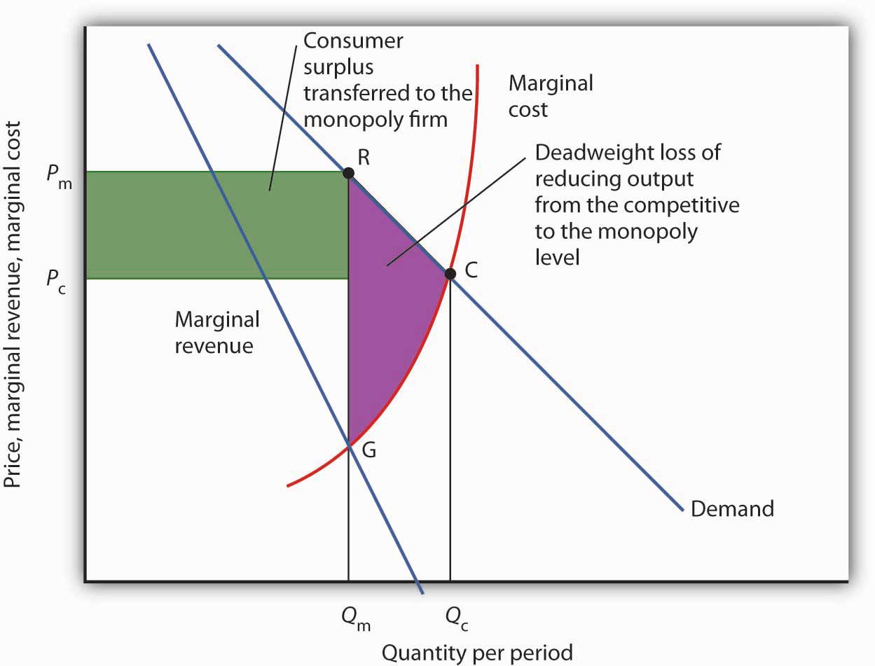 If the industry were competitive, consumer surplus would be the area below the demand curve and above PcC. With monopoly, consumer surplus would be the area below the demand curve and above PmR. Part of the reduction in consumer surplus is the area under the demand curve between Qc and Qm; it is contained in the deadweight loss area GRC. But consumers also lose the area of the rectangle bounded by the competitive and monopoly prices and by the monopoly output; this lost consumer surplus is transferred to the monopolist.