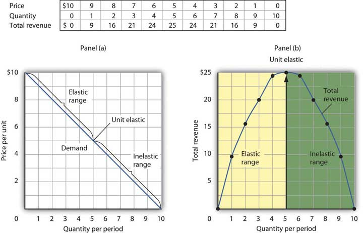 This demand equation implies the demand schedule shown in Figure 10.3 "Demand, Elasticity, and Total Revenue". Total revenue for each quantity equals the quantity times the price at which that quantity is demanded. The monopoly firm’s total revenue curve is given in Panel (b). Because a monopolist must cut the price of every unit in order to increase sales, total revenue does not always increase as output rises. In this case, total revenue reaches a maximum of $25 when 5 units are sold. Beyond 5 units, total revenue begins to decline.