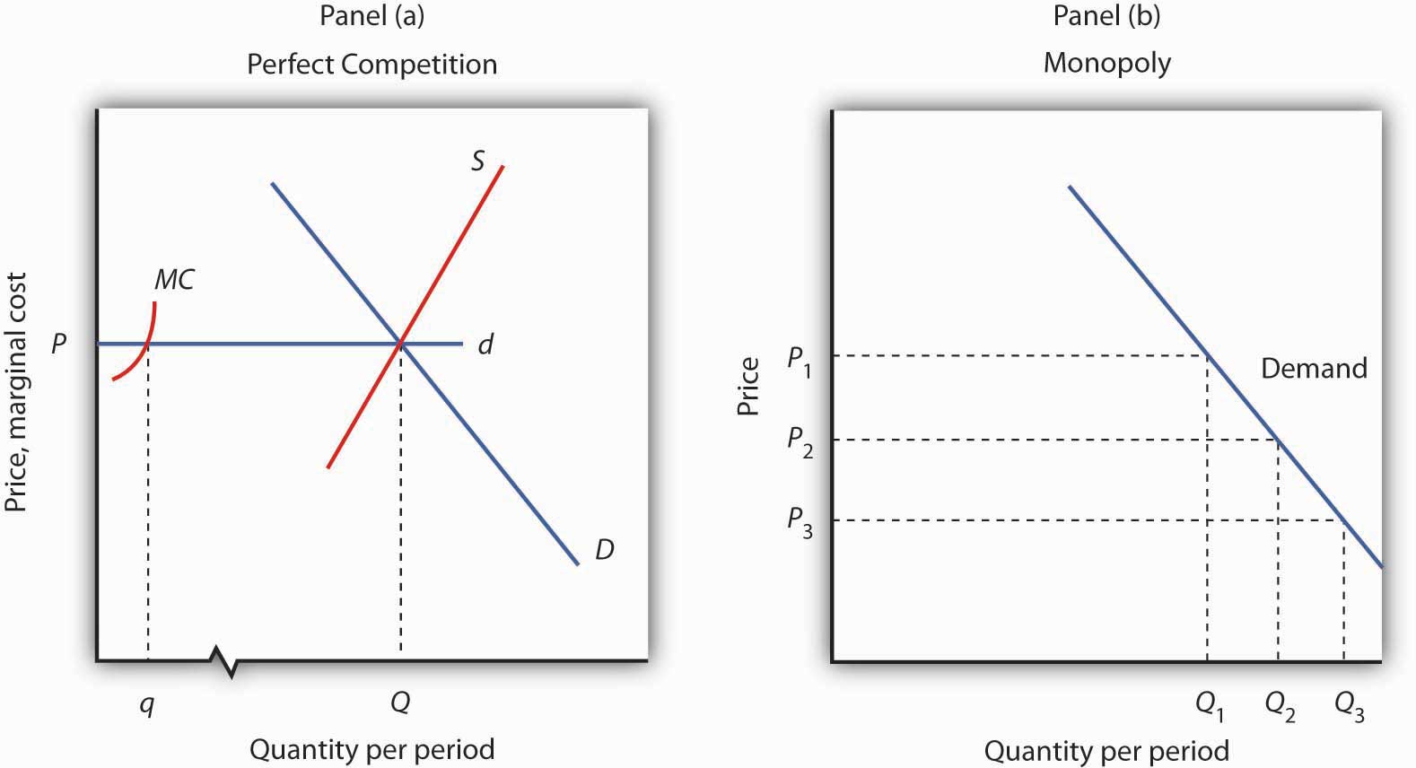 Panel (a) shows the determination of equilibrium price and output in a perfectly competitive market. A typical firm with marginal cost curve MC is a price taker, choosing to produce quantity q at the equilibrium price P. In Panel (b) a monopoly faces a downward-sloping market demand curve. As a profit maximizer, it determines its profit-maximizing output. Once it determines that quantity, however, the price at which it can sell that output is found from the demand curve. The monopoly firm can sell additional units only by lowering price. The perfectly competitive firm, by contrast, can sell any quantity it wants at the market price.