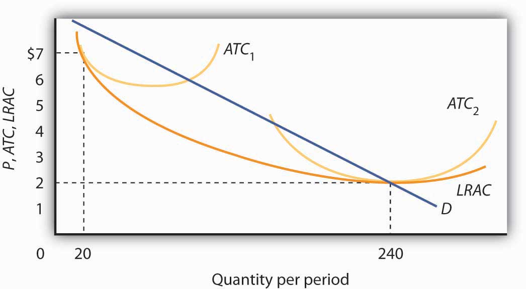 A firm with falling LRAC throughout the range of outputs relevant to existing demand (D) will monopolize the industry. Here, one firm operating with a large plant (ATC2) produces 240 units of output at a lower cost than the $7 cost per unit of the 12 firms operating at a smaller scale (ATC1), and producing 20 units of output each.