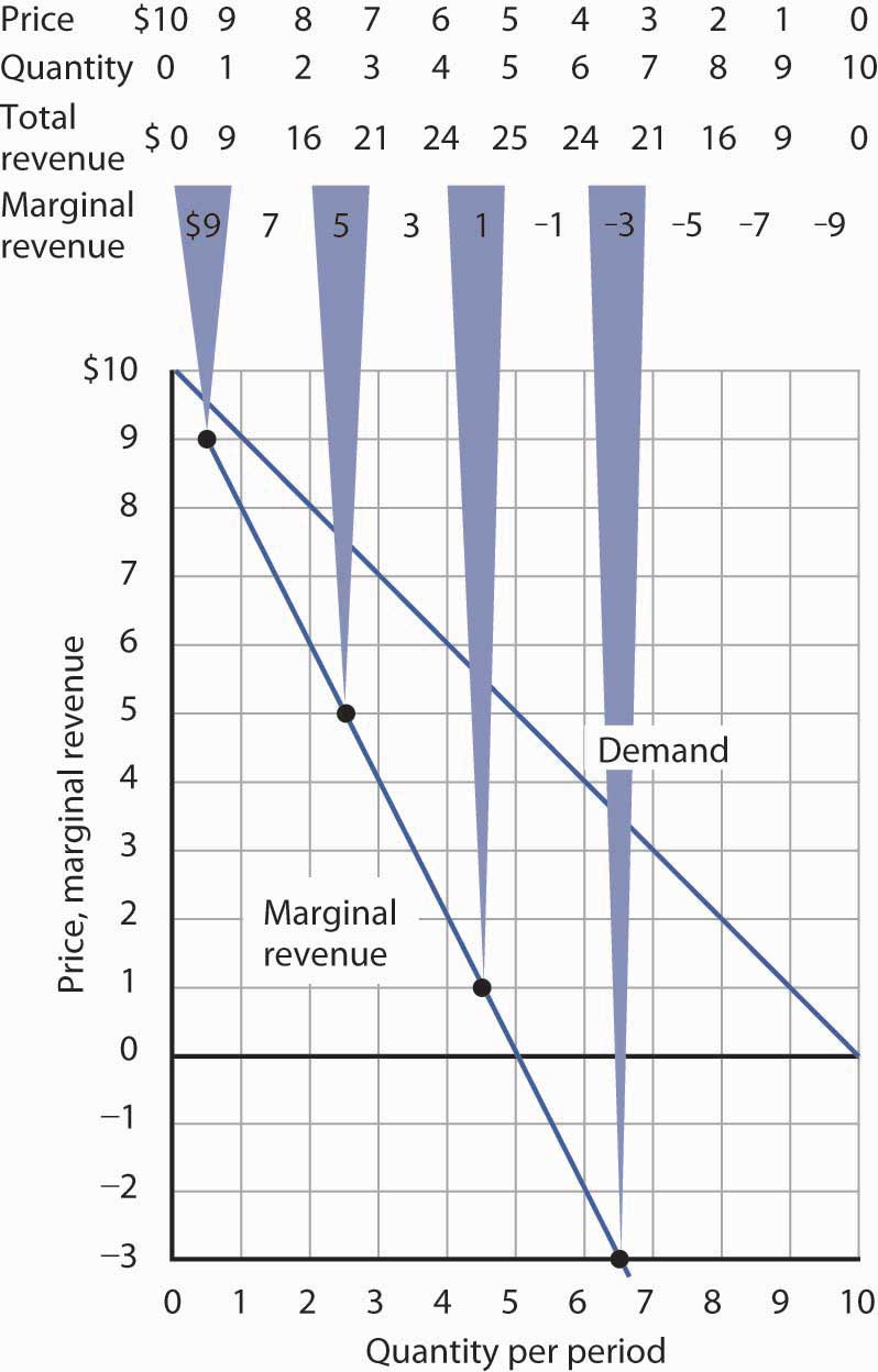 When the demand curve is linear, as in Figure 10.4 "Demand and Marginal Revenue", the marginal revenue curve can be placed according to the following rules: the marginal revenue curve is always below the demand curve and the marginal revenue curve will bisect any horizontal line drawn between the vertical axis and the demand curve. To put it another way, the marginal revenue curve will be twice as steep as the demand curve. The demand curve in Figure 10.4 "Demand and Marginal Revenue" is given by the equation , which can be written . The marginal revenue curve is given by , which is twice as steep as the demand curve.