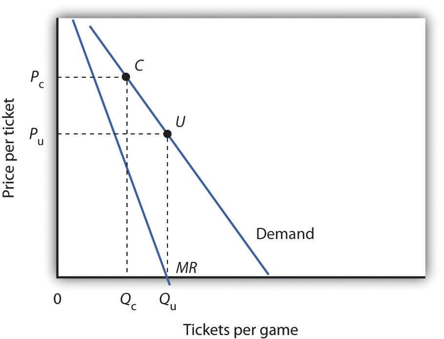 Stadium size and the demand curve facing a team might prevent the team from selling the profit-maximizing quantity of tickets. If its stadium holds only Qc fans, for example, the team will sell that many tickets at price Pc; its marginal revenue is positive at that quantity. Economic theory thus predicts that the marginal revenue for teams that consistently sell out their games will be positive, and the marginal revenue for other teams will be zero.