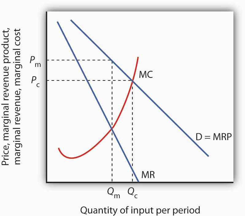 A monopoly supplier of a factor faces a demand curve that represents the MRP of the factor. This situation is illustrated in Figure 14.6 "Monopoly Factor Supply". The firm will charge a price Pm equal to the MRP of the factor and sell Qm units of the factor.