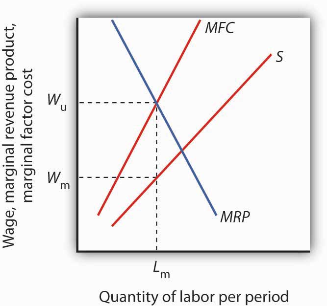 If the union has monopoly power over the supply of labor and faces a monopsony purchaser of the labor the union represents, the wage negotiated between the two will be indeterminate. The employer will hire Lm units of the labor per period. The employer wants a wage Wm on the supply curve S. The union will seek a wage close to the maximum the employer would be willing to pay for this quantity, Wu, at the intersection of the marginal revenue product (MRP) and the marginal factor cost (MFC) curves. The actual wage will be somewhere between these two amounts.